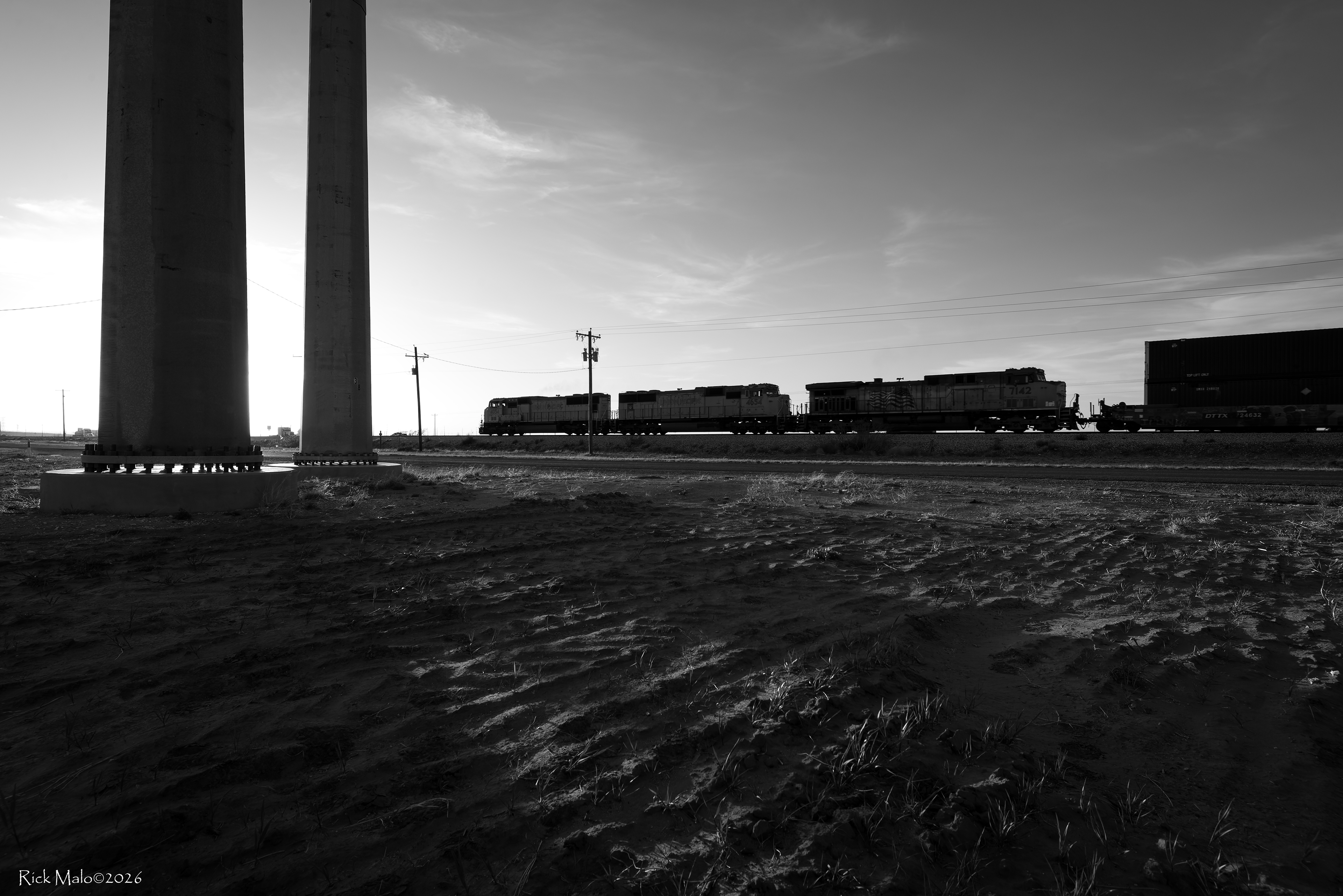 Our intentions included the heft of 500 millimeters and sun glinting off the wires looping between the pole lines as we focused back west down the tracks toward Midland.