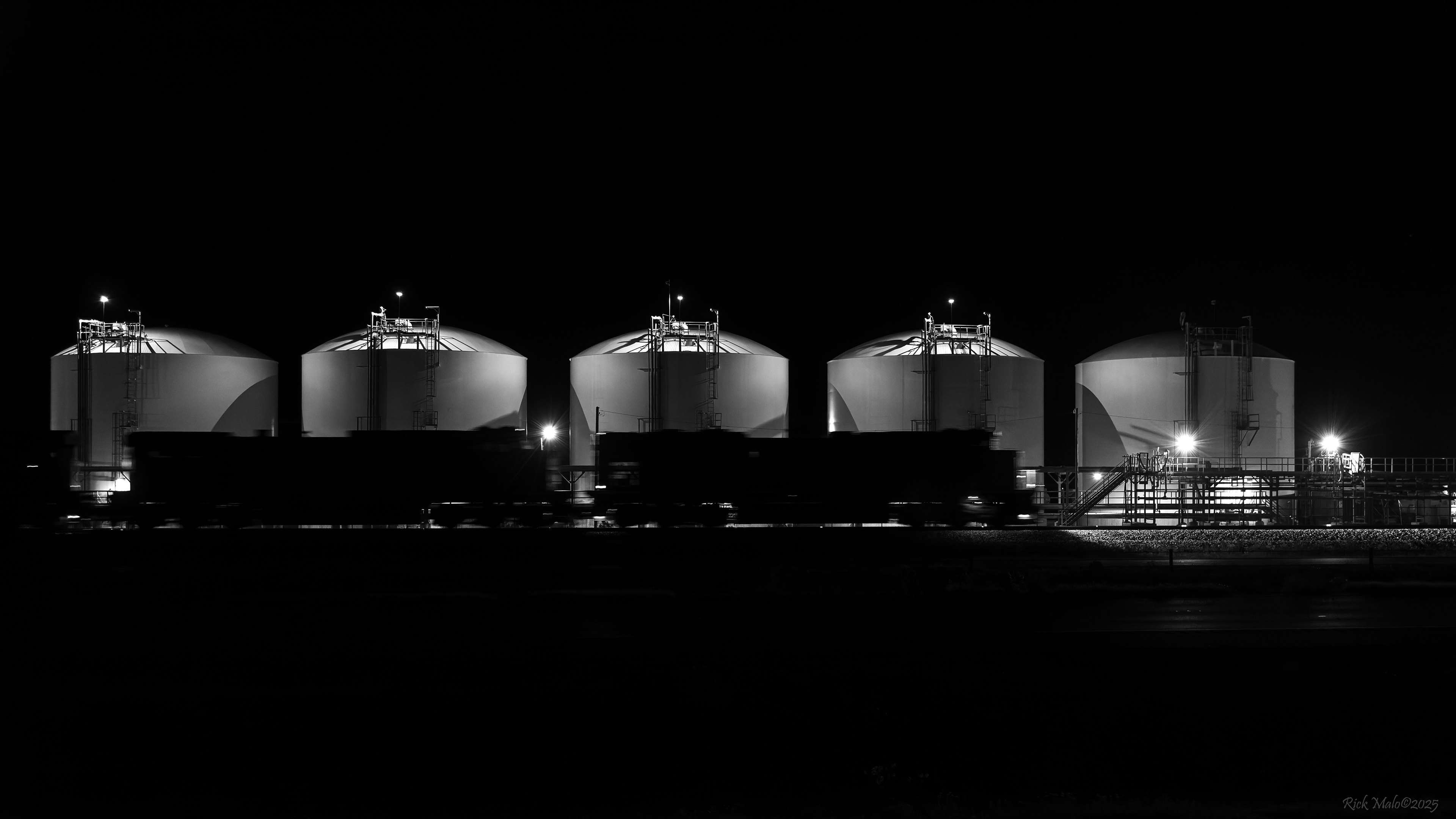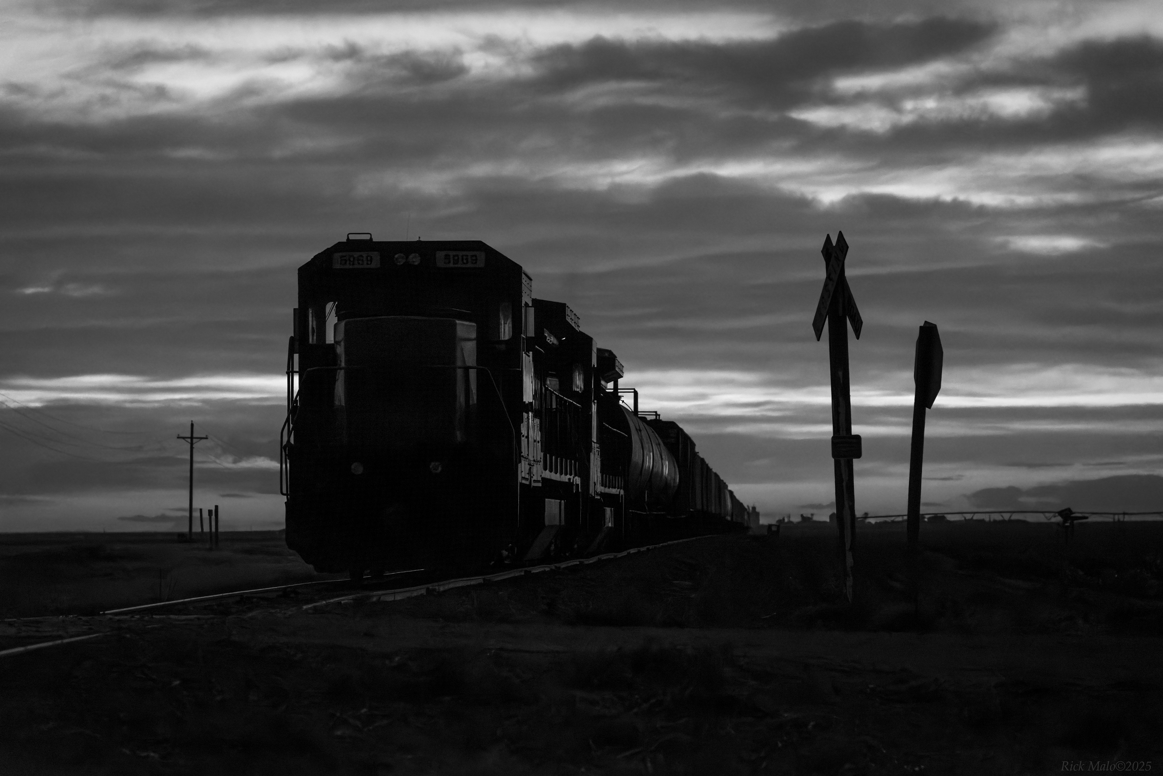 The DPU of a westbound freight rolls through Midland, Texas at dusk.