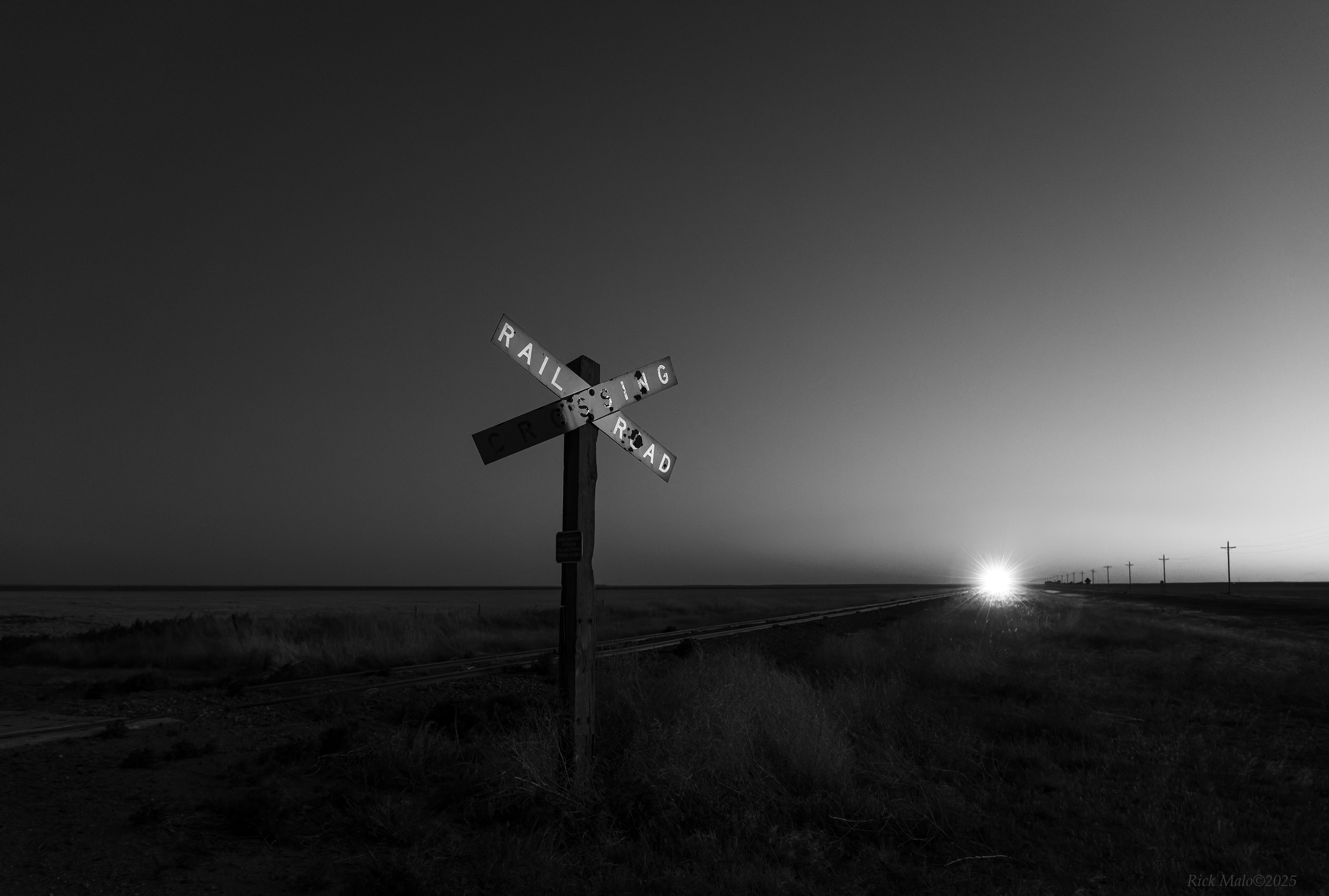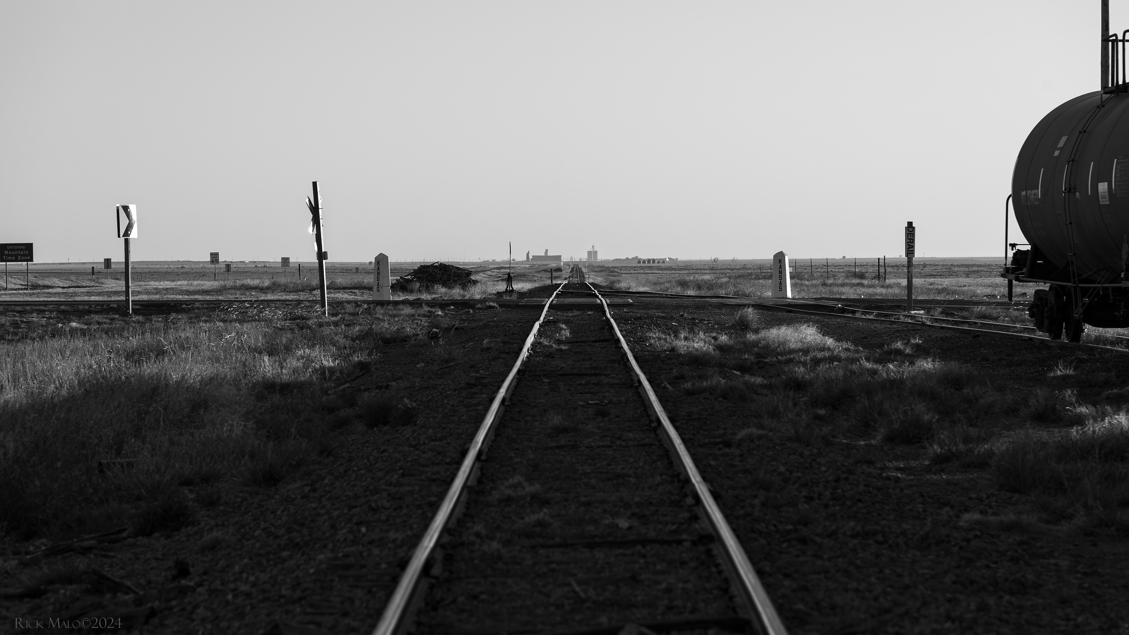 A westbound grain train rolls into Higgins, Texas as this warning sign proclaims prior ownership.