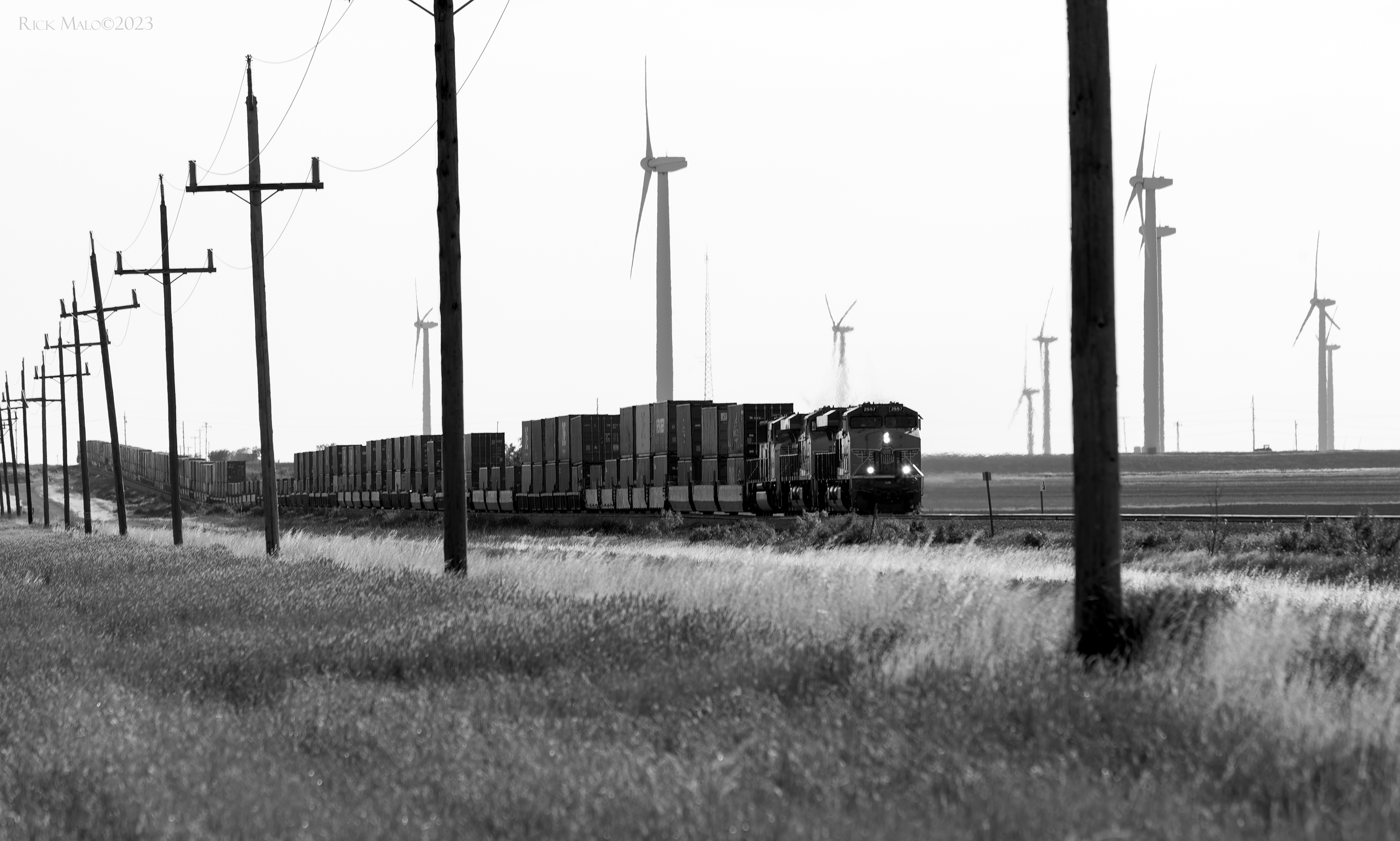 A warm June 2020 day sees an eastbound stack train rolling off Loraine Hill and speeding across the wheatfields near Roscoe.
