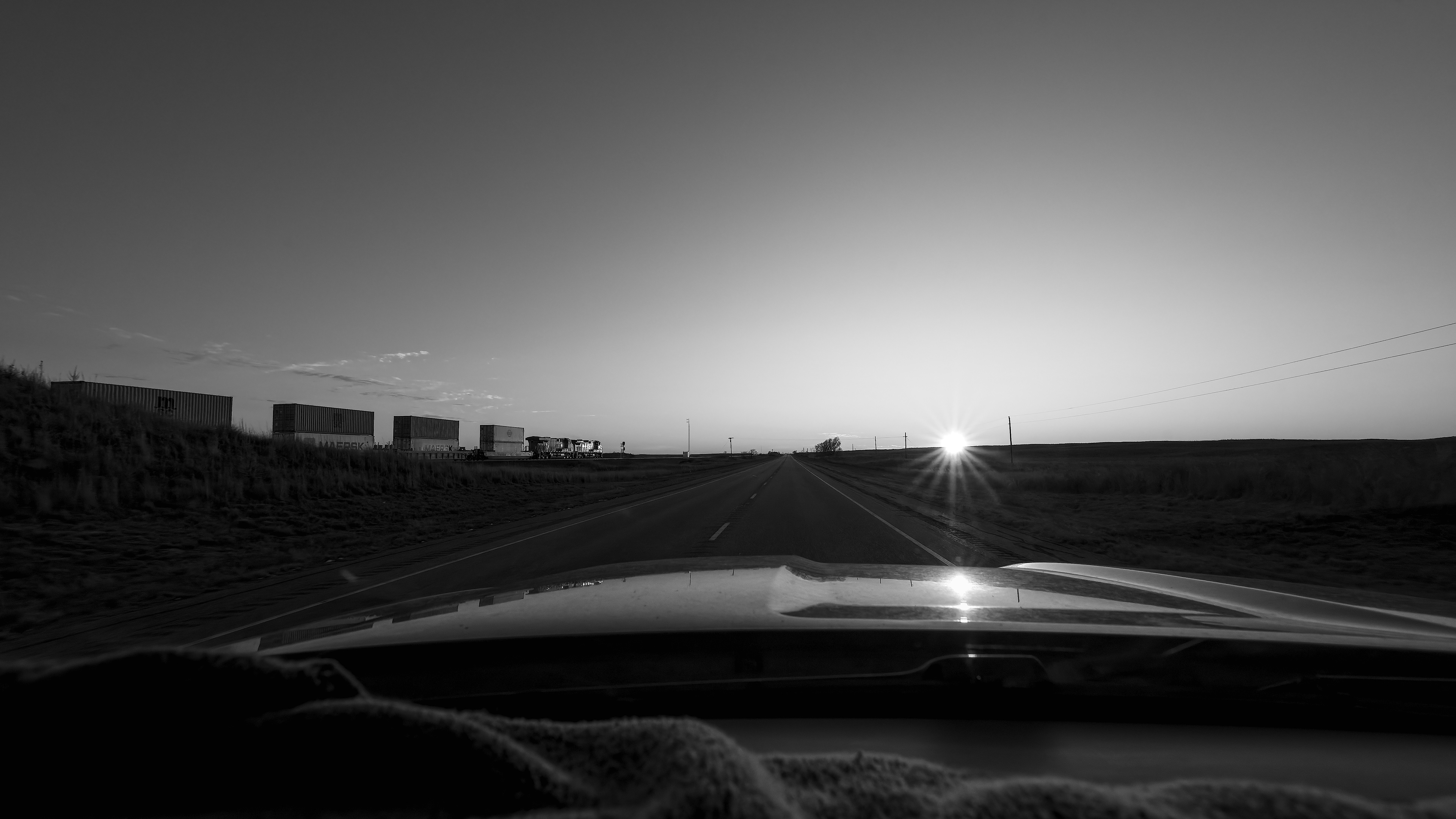 Sunset, February 17th, 2024 finds us rolling west on US Highway 60 pacing a BNSF stack train through Lipscomb County, Texas.