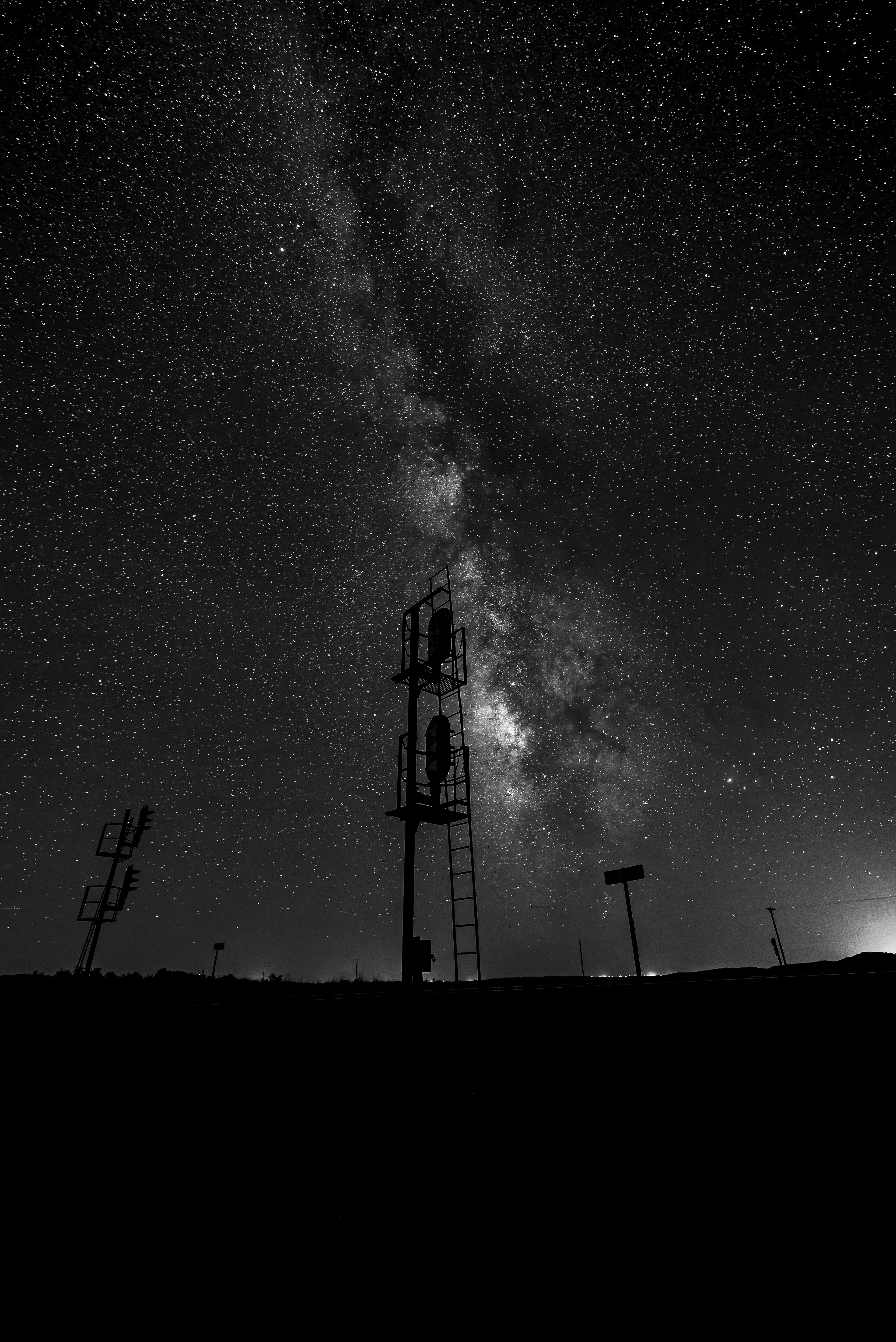 On a summer night on the very edge of Hemphill County, Texas, the Milky Way rises behind the signals at the Coburn Crossovers, 5 miles east of Glazier.