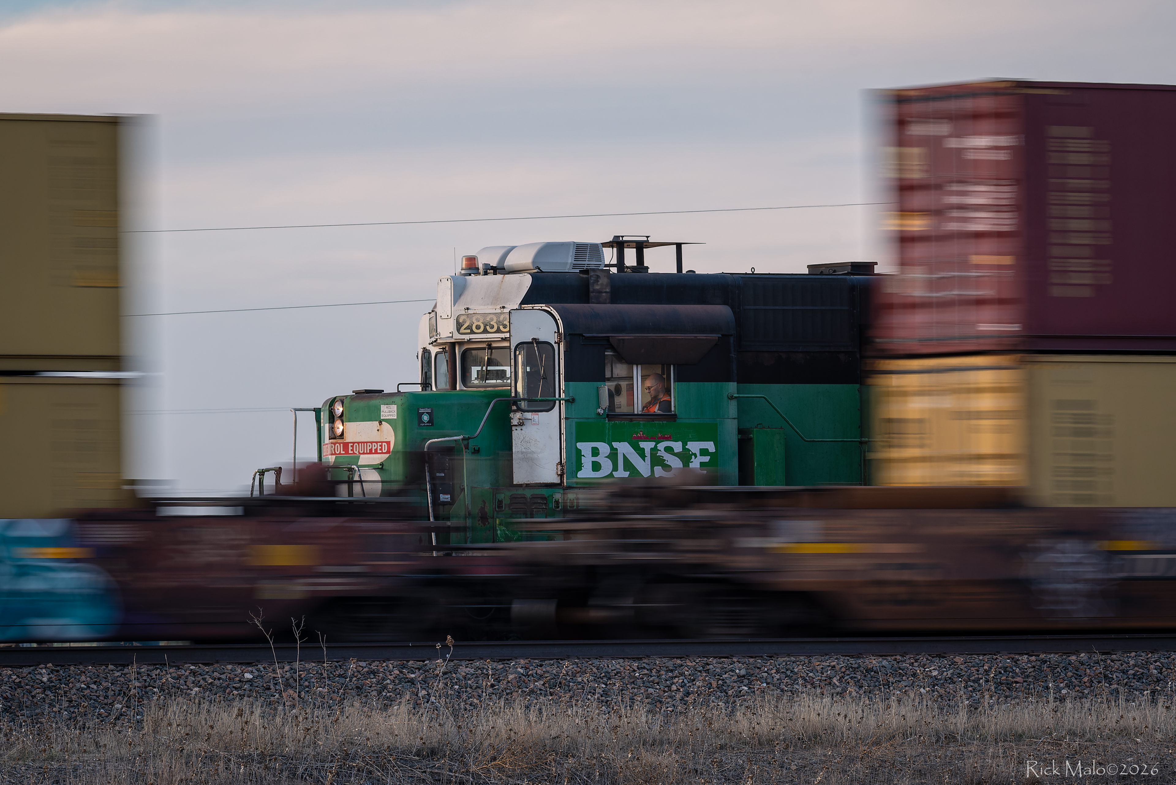 A fast GEVO-powered westbound intermodal slams by. He hardly notices the juxtaposition; the situational irony.