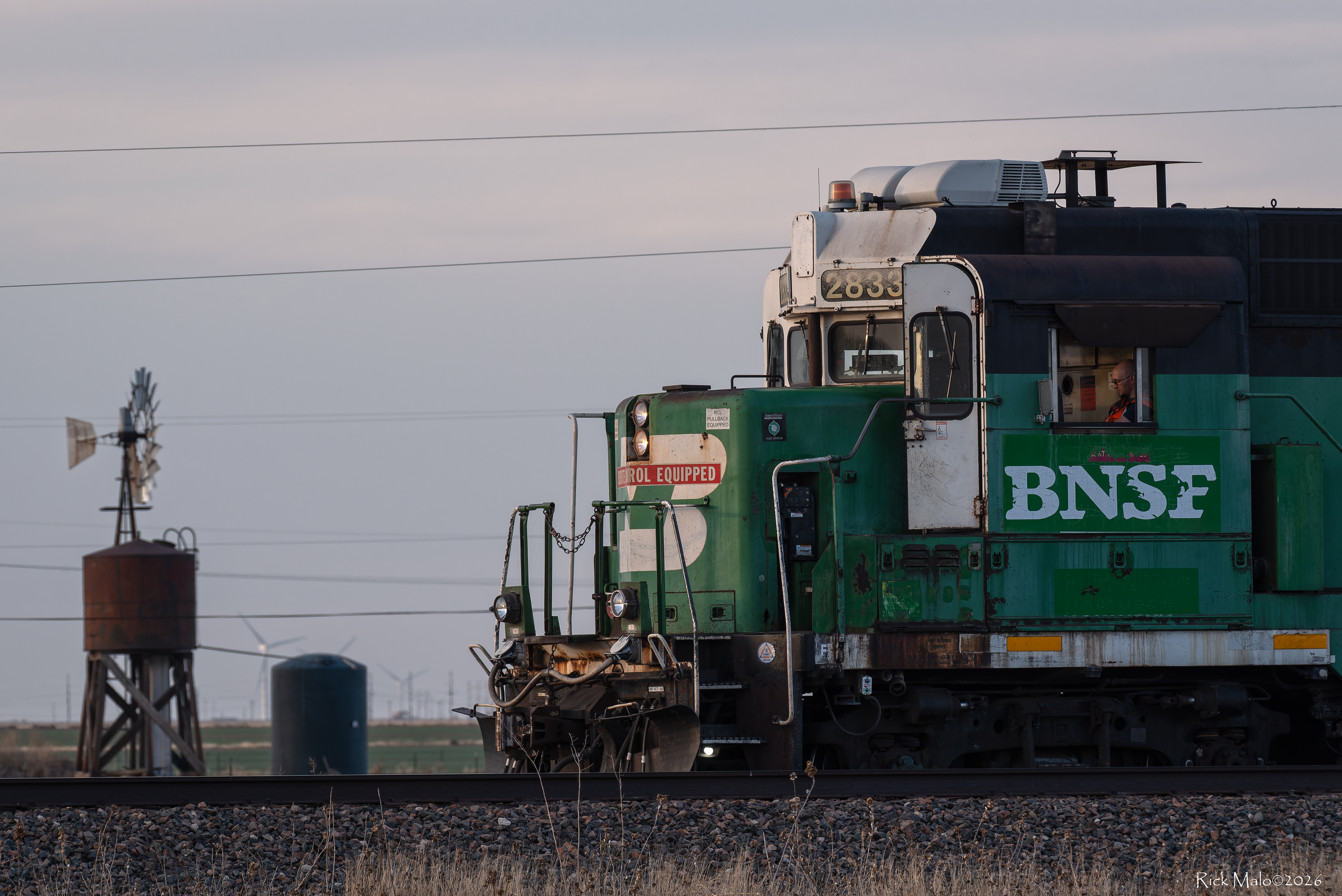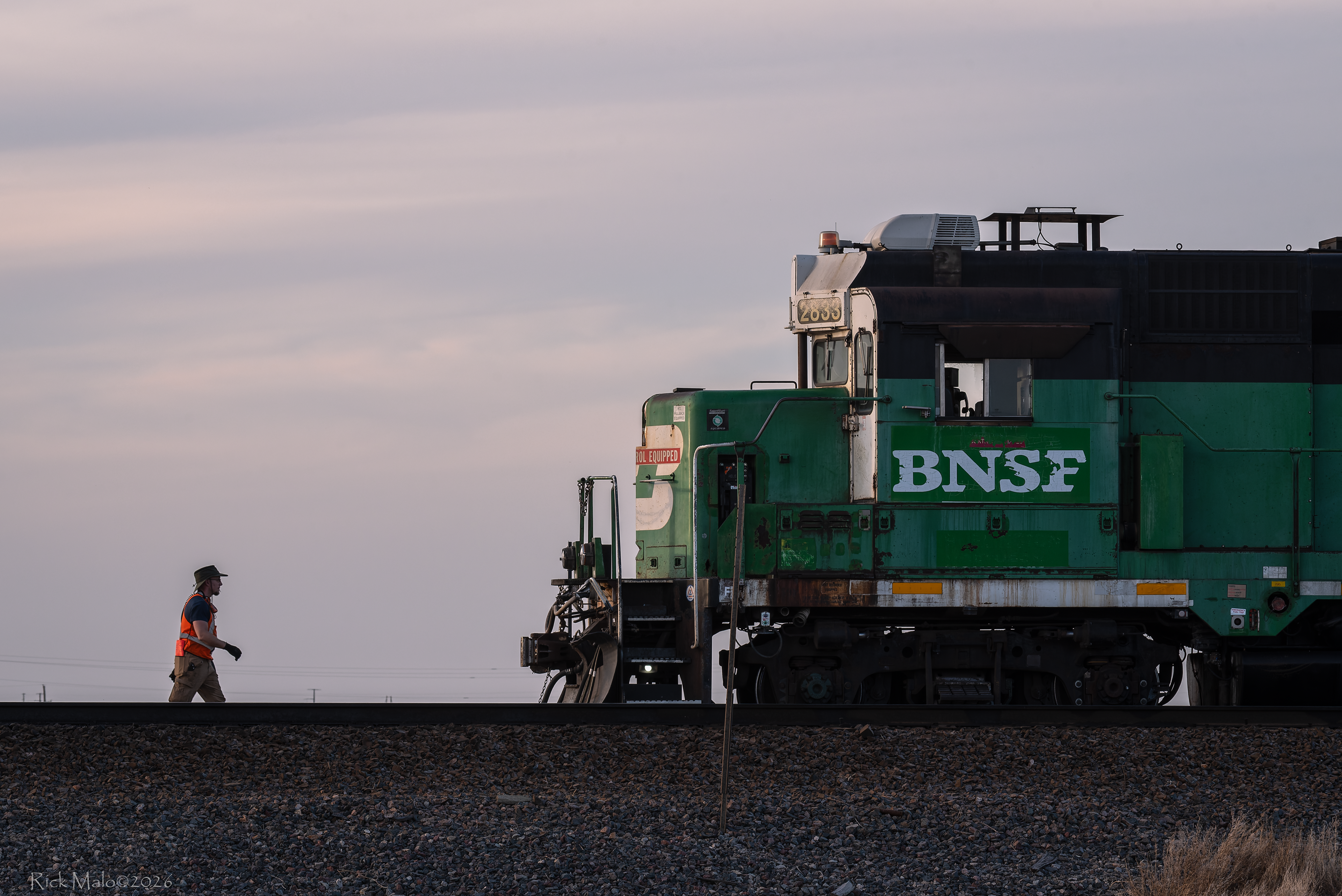 Here, on a pleasant Spring evening out on the Plains of Texas, amid the stout aromas of the Tyson beef packing plant just east of Amarillo, a 63-year-old veteran cuts a visage against a cloudy sky. The conductor has pulled the pin on a cut of cars and walks back to reboard the aged unit.